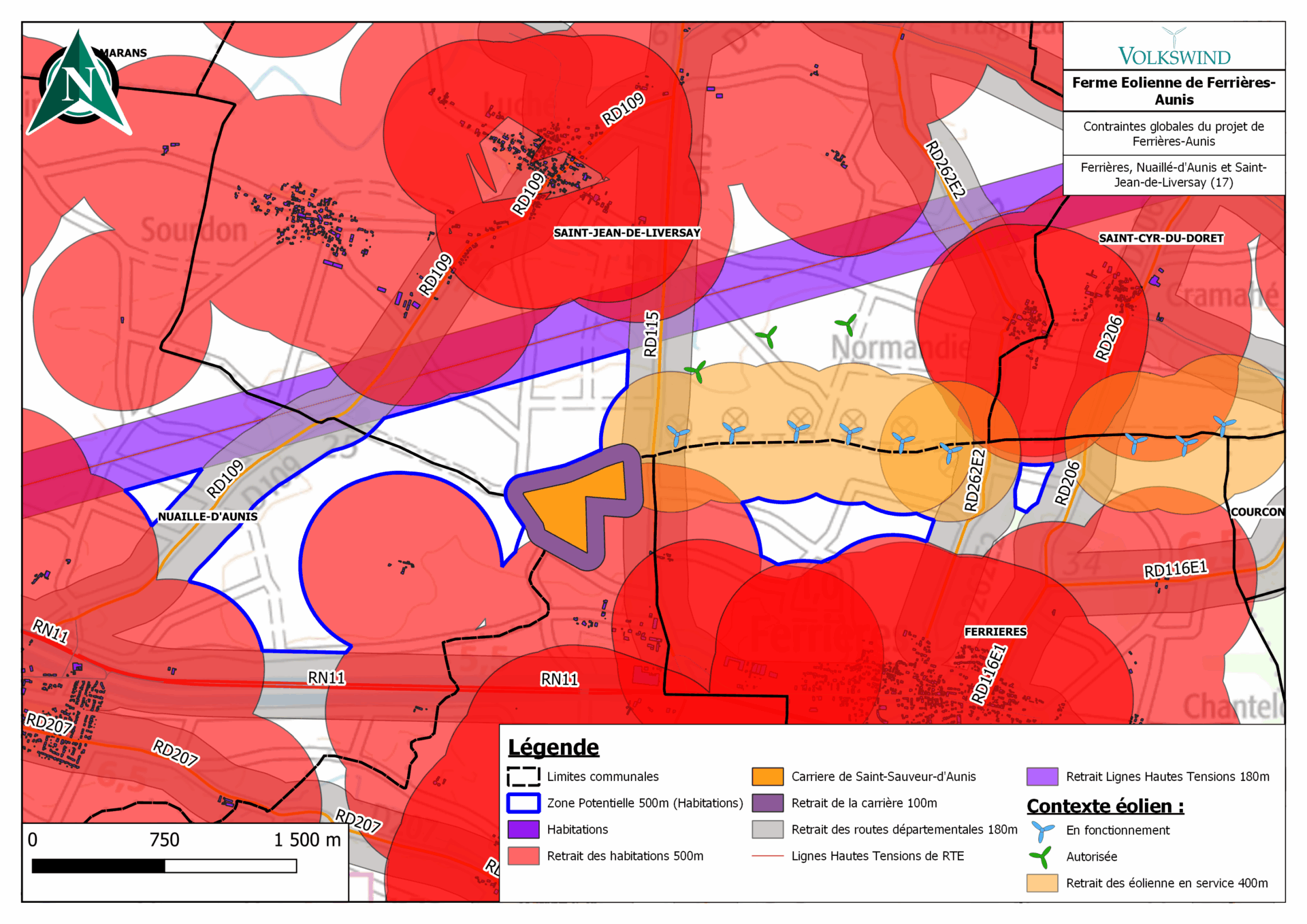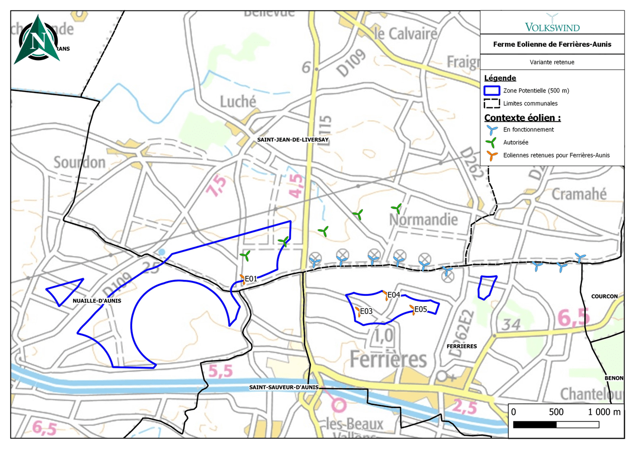 Le projet éolien de Ferrières-Aunis est situé sur les communes de Ferrières et Saint-Jean-de-Liversay, en extension du parc autorisé de Saint-Jean-de-Liversay et des parcs existants des Moindreaux Energies et d’Aunis Energie. Ce projet se situe au nord de la route nationale 11, au nord-ouest de Ferrières, au sud-ouest de Saint-Jean-de-Liversay et au sud-est de Nuaillé-d’Aunis.